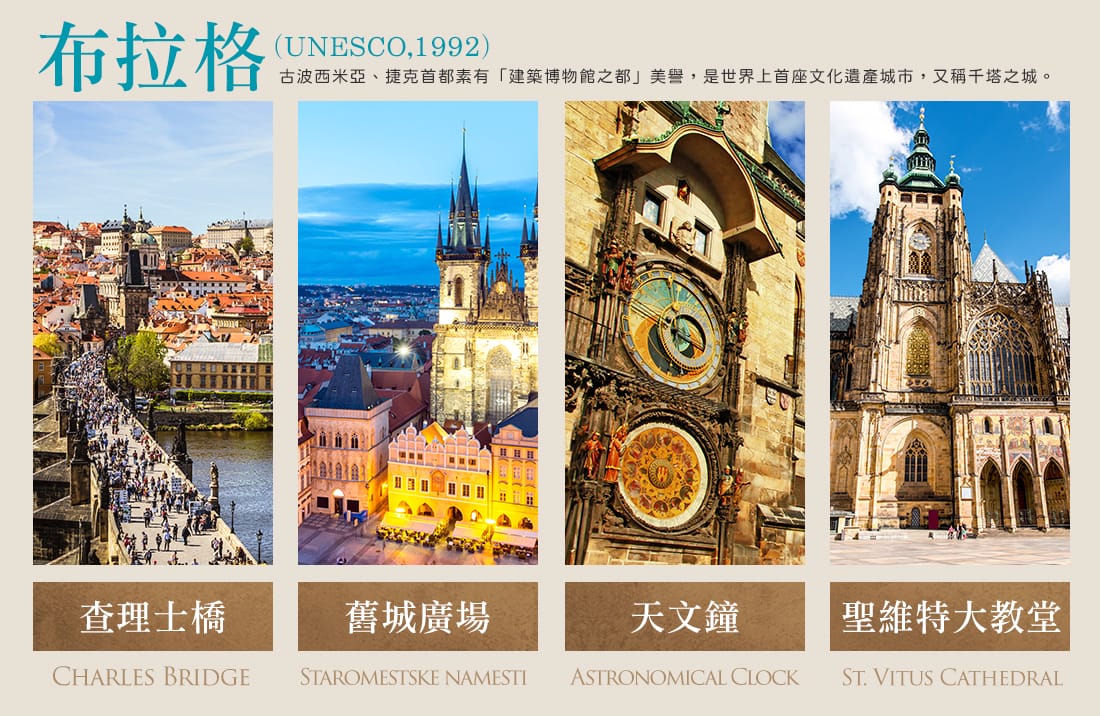 古堡皇宮區舊皇宮裡尋找往昔貴族遺跡,聖維塔大教堂中欣賞美麗的玻璃花窗、精采的細部雕刻;駐足於火藥塔、修道院、皇家花園間,聽見傳說與歷史真真假假交錯;童話故事般的建築與街道,在川流不息的遊客中繼續上演著這一個世紀的劇本。