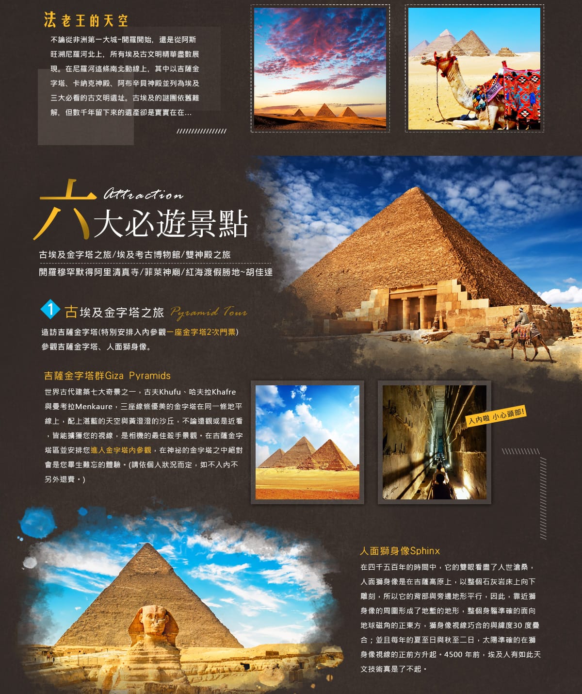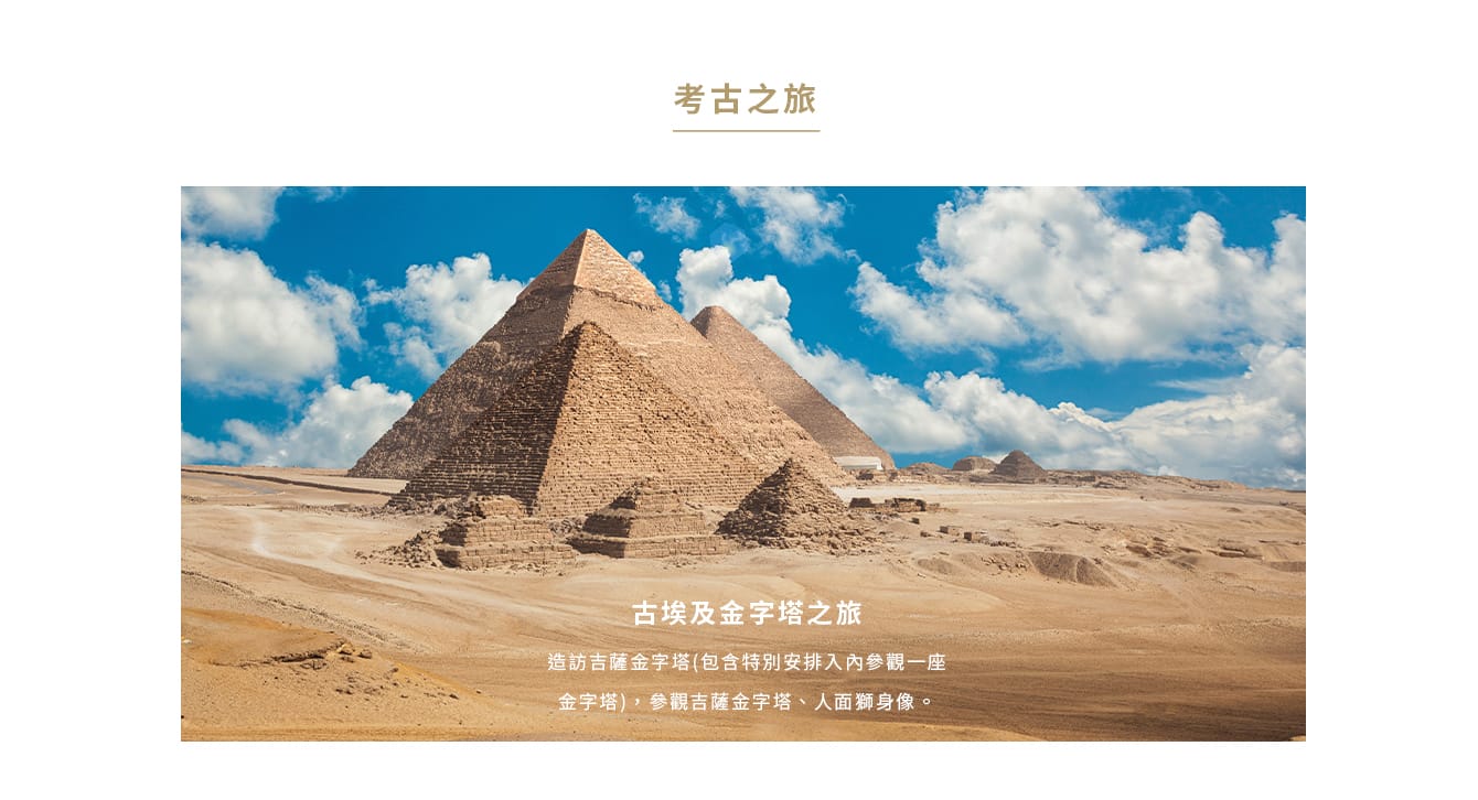 - 唯一倖存的古代七大奇蹟—吉薩金字塔尋奇,特別安排正宗沙漠騎駱駝、入內參觀一座金字塔。