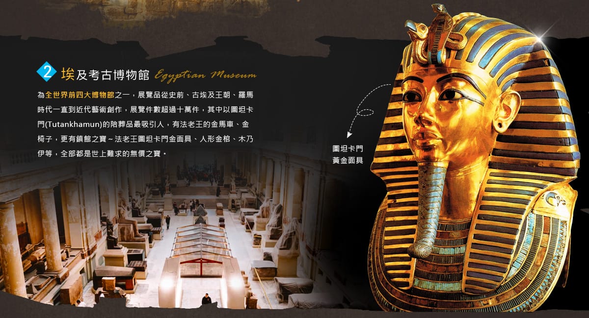 *埃羅現今有三間大型博物館,我們會依照當前文物(例如:圖坦卡門黃金面具、法老皇家木乃伊)所在,挑選安排兩間最佳的博物館,讓貴賓可以有最完整的體驗)