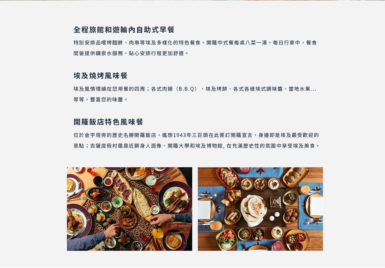 - 安排尼羅河畔景觀餐廳、百年文學餐廳等多樣特色料理,讓您吃得開心。