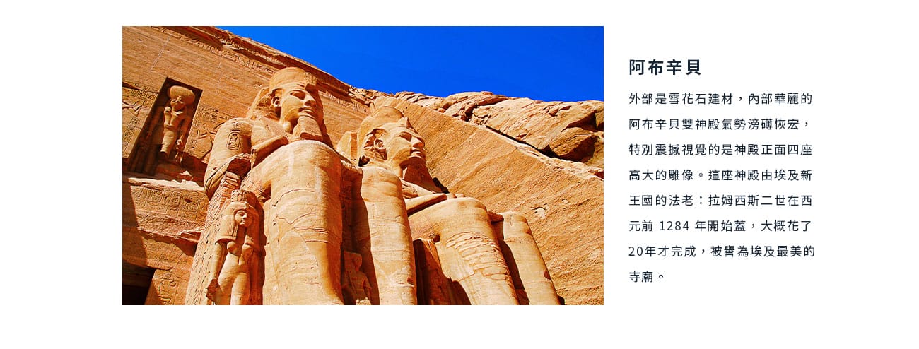 - 三大神殿之旅~卡納克神殿、路克索神殿、柯蒙波神殿,讓您充滿震撼及感動,遙想古文明的偉大。