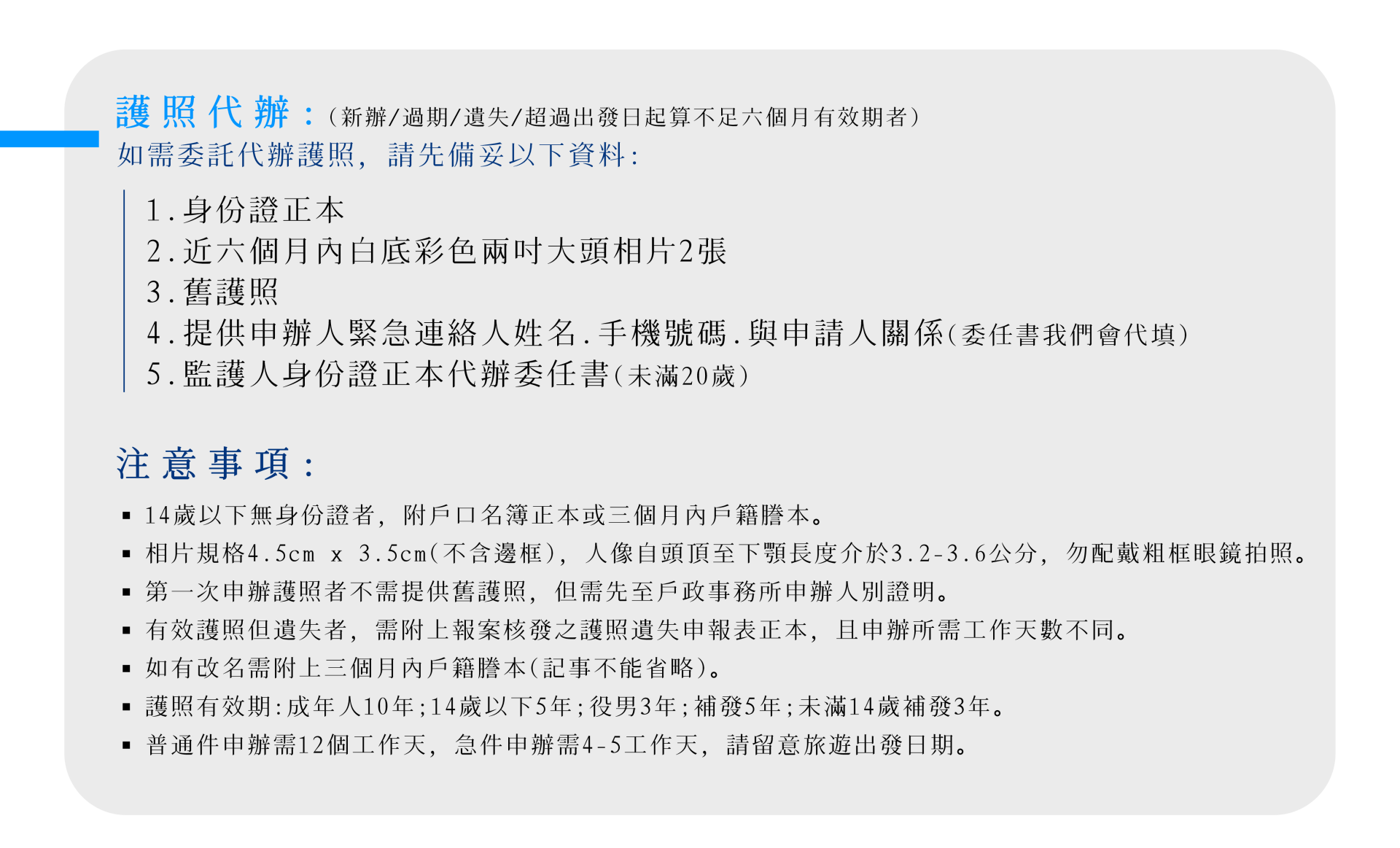 * 請依照申辦項目如實填寫 申請人姓名 手機號碼 Line ID E-mail 代辦項目 (可複選) 護照代辦 台胞證代辦 簽證代辦 機票代訂 住宿代訂 護照/台胞證辦理速別 (可複選) 護照普通件 護照急件 台胞證普通件 台胞證急件 申辦護照原因 (護照代辦必填) 首次新辦 過期換發 遺失補發 更名換發 申辦台胞證原因 (台胞證代辦必填) 首次新辦 過期換發 遺失補發 更名換發 代辦需求 (請依據代辦項目填寫,若無請填無) 代訂機票日期 (出發) 代訂機票日期 (結束) 指定航空公司及艙等 機票張數 代訂住宿日期 (入住) 代訂住宿日期 (退房) 指定飯店及房型 房間數 備註 (如無申辦護照亦無特殊需求請填無) 送出申請