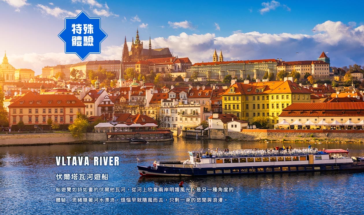 伏爾塔瓦河遊船乘坐伏爾塔瓦河的遊船,用不同的角度來欣賞河岸邊的各式建築,在讚嘆的同時會懷疑自己身陷夢境中。點上一杯咖啡或是道地的啤酒迎著波西米亞的微風,享受恣意漫遊的旅程,透過親身的體驗來感受捷克愛國音樂家史麥塔納在「我的祖國」中所要傳達的意念。